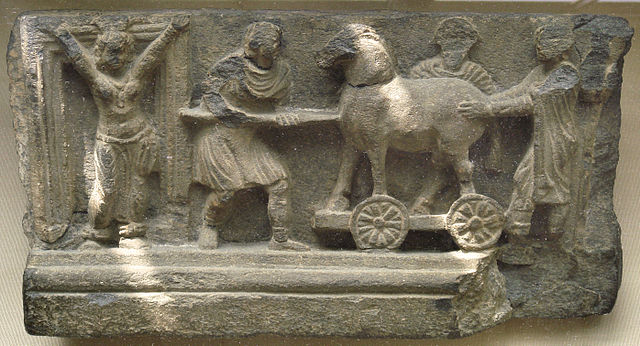 Trojańczycy wprowadzają podarowanego konia na balkon