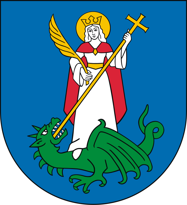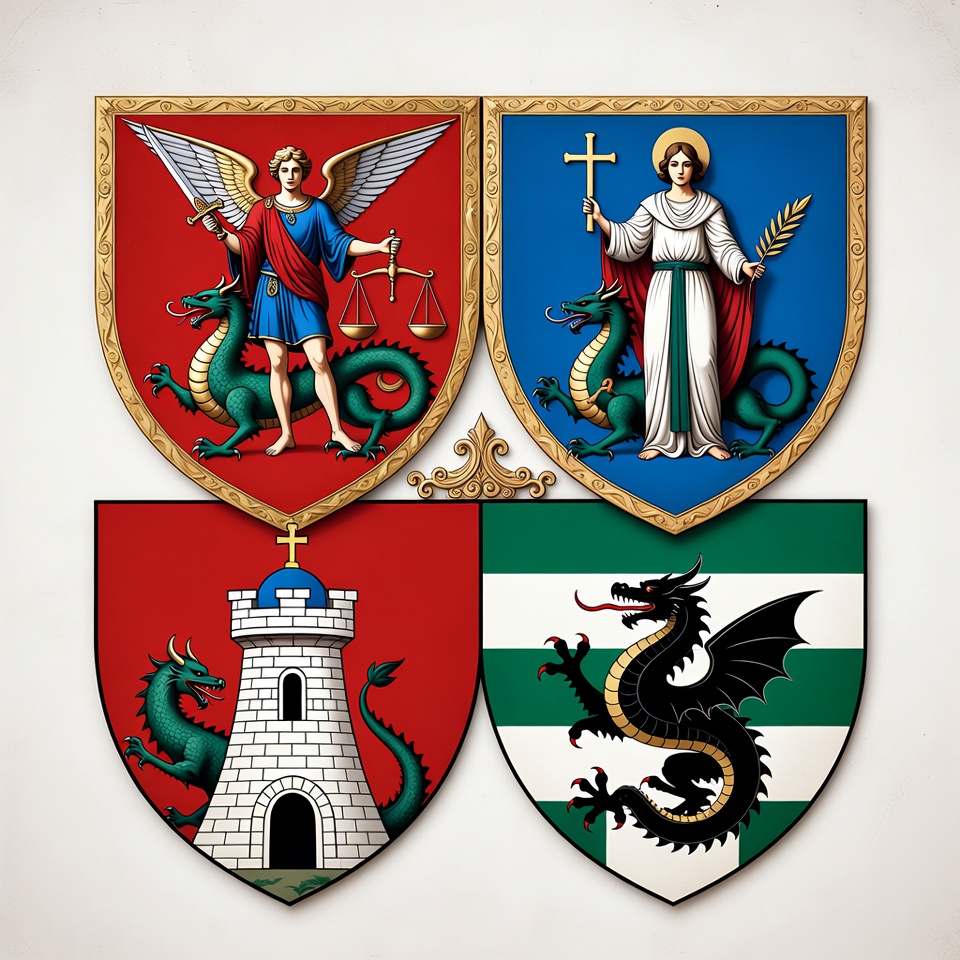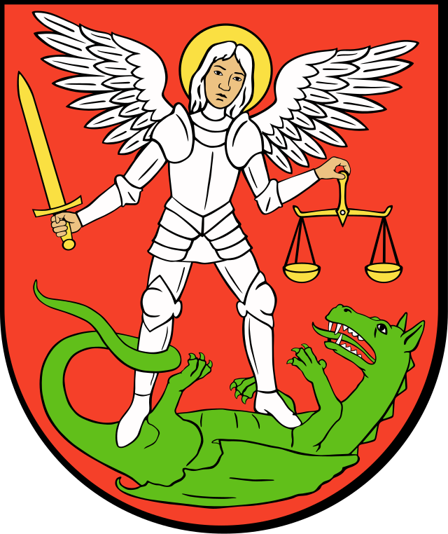Zupełnie inny porządek symboliczny panuje w herbie Białej Podlaskiej. Smok jest tu raniony przez św. Michała Archanioła, wojownika niebiańskiego. To klasyczna scena teologiczna: zwycięstwo porządku nad chaosem.